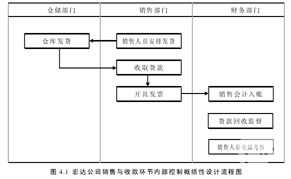 結合前述業(yè)務流程層面內(nèi)部控制分析的銷售與收款、采購與付款、生產(chǎn)與存貨、人力資源與薪酬等評價點指標,選取企業(yè)生產(chǎn)經(jīng)營活動中的重要業(yè)務環(huán)節(jié)的流程和控制作為突破點,評估人員通過日常下戶巡查掌握該企業(yè)的內(nèi)部控制方面的情況信息,根據(jù)增值稅稅種特點,對宏達公司內(nèi)部控制的有效性進行具體分析,增值稅主要涉及銷項稅額和進項稅額的計算,與之對應的內(nèi)部控制分析可以主要針對銷售與收款、采購與付款、生產(chǎn)與存貨、人力資源薪酬等內(nèi)部控制活動,根據(jù)宏達公司的實際情況,選取了部分與增值稅納稅申報關聯(lián)較大的內(nèi)部控制情況進行分析,具體分析結果如下:該企業(yè)銷售環(huán)節(jié)各業(yè)務職能部門的職責和分工如下:銷售部門根據(jù)業(yè)務人員的要求安排倉庫發(fā)貨;發(fā)貨單掛銷售人員個人賬戶,并根據(jù)貨款回收情況對其銷售業(yè)績進行考核;以是否收到貨款作為開具發(fā)票的依據(jù)。倉庫部門按照銷售部門的要求發(fā)貨。財務部門根據(jù)銷售部門開具的發(fā)票收取貨款并作銷售入賬處理,同時負責對貨款的回收和業(yè)務人員的監(jiān)督考核。月末三方進行對賬。通過對這一內(nèi)控制度的分析,可以看出該企業(yè)對銷售收入實現(xiàn)的確認不是以權責發(fā)生制原則為依據(jù),而是以是否收到貨款作為開具發(fā)票并計收入的依據(jù),這一會計處理方法導致部分貨物銷售后未及時作收入,銷售環(huán)節(jié)的內(nèi)部控制設計沒能有效的監(jiān)控到銷售收入的及時入賬。銷售與收款環(huán)節(jié)內(nèi)部控制的概括性流程見圖 4.1。
