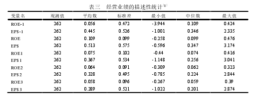 本章首先對(duì)樣本做描述性統(tǒng)計(jì),然后進(jìn)行了相關(guān)性分析,其次對(duì)定向增發(fā)前后經(jīng)營(yíng)業(yè)績(jī)進(jìn)行對(duì)比分析,再次對(duì)假設(shè)一和假設(shè)二進(jìn)行多元回歸分析,最后闡述穩(wěn)健性檢驗(yàn)的結(jié)果。
