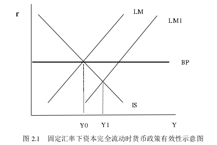 蒙代爾—弗萊明模型是蒙代爾和弗萊明在開放條件下提出的,以商品市場、貨幣市場、外匯市場的一般均衡為基本分析框架的宏觀經(jīng)濟(jì)模型。此模型基于??怂购蜐h森提出的“IS-LM 模型”和米德的國際收支理論,將匯率機(jī)制納入了一般均衡分析。接下來分別討論固定匯率和浮動匯率下,不同資本流動形勢下貨幣政策的有效性。當(dāng)資本完全流動時(shí),利率的小幅度上升將引起資本的大量流入,因此國際收支曲線BP 彈性較大,為一條水平線。起初該國內(nèi)外部均衡點(diǎn)處于 IS、LM、BP 的交點(diǎn)處,此時(shí)的收入水平為 Y0,在固定匯率制度下,當(dāng)一國采取擴(kuò)張性的貨幣政策時(shí),LM 曲線將向右移動至 LM1,此時(shí)利率下降,產(chǎn)出水平為 Y1,但同時(shí)資本大量流出,本幣面臨貶值的壓力。為了維持匯率的穩(wěn)定性,貨幣當(dāng)局出售外幣,回收本幣,導(dǎo)致國內(nèi)貨幣供給量下降。貨幣供給曲線 LM1 向左上方移動,并重新回到原來的位置。此時(shí),內(nèi)外部均衡點(diǎn)位置沒有改變,收入水平仍維持在原先水平,貨幣政策無效。具體如圖 2.1 所示。