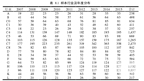 本章選取了 2005 至 2015 年的 2996 所滬深 A 股上市公司的年度財務(wù)報告數(shù)據(jù)為研究對象。對應(yīng)分析師跟蹤數(shù)據(jù)為滯后變量,且由于數(shù)據(jù)可獲取性,選取的相應(yīng)時間段為 2004-2014年。對樣本篩選的具體步驟如下:①剔除金融、保險業(yè)公司 58 家,由于金融相關(guān)行業(yè)的財務(wù)業(yè)績等計算具有行業(yè)特殊性,與其他行業(yè)區(qū)別較大,因此將其從樣本中剔除;②剔除首年上市公司、已退市公司、創(chuàng)業(yè)板公司 696 家,創(chuàng)業(yè)板及已退市公司在融資動機及業(yè)績獎勵計劃等方面與主板及中小板公司存在較大差異,而首年上市公司由于缺少前一期數(shù)據(jù),因此將此類樣本公司剔除;③剔除重要財務(wù)數(shù)據(jù)缺失樣本;④刪除分析師相關(guān)跟蹤數(shù)據(jù)缺失個觀測值。剩余研究樣本包含 16,888 個公司-年度觀測值。上市公司財務(wù)報表數(shù)據(jù)來自國泰安CSMAR 數(shù)據(jù)庫,分析師相關(guān)數(shù)據(jù)來自萬得 WIND 金融數(shù)據(jù)庫。數(shù)據(jù)篩選和處理應(yīng)用 STATA 13.0 軟件。本文按照中國證監(jiān)會《上市公司行業(yè)分類指引》(2001)的一級代碼對于行業(yè)進行劃分,研究樣本的行業(yè)-年度分布如表 8.1 所示。但在數(shù)據(jù)分析時,對于制造業(yè),按照研究慣例細分至二級代碼,因此樣本觀測值所處行業(yè)共涉及到19 個。