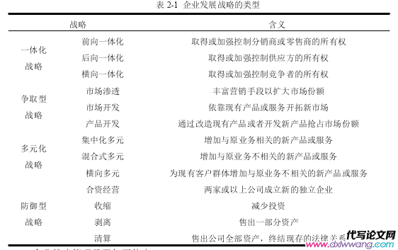 戰(zhàn)略管理是從企業(yè)遠期發(fā)展目標出發(fā),分析企業(yè)所處的內外部環(huán)境,確定最佳戰(zhàn)略方案,按此實施并獲得反饋意見的一種組織管理手段[39]。戰(zhàn)略管理的目的是保證企業(yè)擁有持續(xù)的競爭優(yōu)勢,戰(zhàn)略制定者必須明確企業(yè)預期戰(zhàn)略以及采用何種方式來實現(xiàn)預期戰(zhàn)略目標[40]。企業(yè)發(fā)展戰(zhàn)略的主要類型如表 2-1 所示[41]。企業(yè)應當根據所處的不同環(huán)境,選擇相適應的戰(zhàn)略管理方法。企業(yè)戰(zhàn)略管理呈現(xiàn)如下特點:(1)全局性。企業(yè)發(fā)展戰(zhàn)略必須以企業(yè)整體為視角,深入分析企業(yè)所處的政治、經濟、技術、文化環(huán)境,從而為實現(xiàn)企業(yè)預期發(fā)展目標制定出全局性的戰(zhàn)略規(guī)劃。(2)長遠性。企業(yè)戰(zhàn)略管理是面向未來的遠期管理。為此,企業(yè)必須對未來發(fā)展環(huán)境進行評估,針對可能出現(xiàn)的情況預先提出防控措施,制定長遠性的戰(zhàn)略規(guī)劃。(3)競爭性。市場經濟面臨著激烈的競爭,在此環(huán)境下,企業(yè)必須明確自身存在的優(yōu)勢與劣勢,抓住機遇,尋找適合自身發(fā)展的經營模式,塑造核心競爭力,實現(xiàn)企業(yè)又快又好發(fā)展。(4)相對穩(wěn)定性與動態(tài)性。企業(yè)戰(zhàn)略是企業(yè)經營管理的重要指導,在一段時期必須保持相對穩(wěn)定。當企業(yè)內外部環(huán)境發(fā)展較大變化時,必須對戰(zhàn)略進行及時調整,使企業(yè)保持持續(xù)的競爭優(yōu)勢[42]。