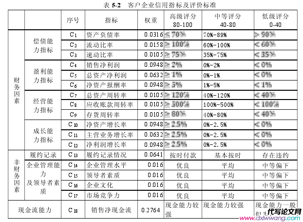(5)本文在研究過程中發(fā)現(xiàn),風(fēng)險度量模型指標的選取具有一定的局限性,本文研究中采用了財務(wù)指標、非財務(wù)指標和現(xiàn)金流情況三部分構(gòu)成的指標體系對 T 化工企業(yè)客戶信用風(fēng)險進行評價,雖能在一定程度上體現(xiàn) T 化工企業(yè)客戶信用狀況,但并不一定適用本行業(yè)所有企業(yè)的信用評價標準。