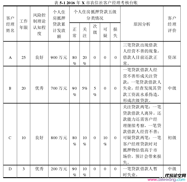 針對由于客戶經(jīng)理業(yè)務(wù)能力參差不齊造成的風(fēng)險,可以通過對客戶經(jīng)理建立業(yè)務(wù)考核臺賬,對客戶經(jīng)理工作能力進(jìn)行評級。通過對每一名客戶經(jīng)理過去發(fā)放的貸款統(tǒng)計不良貸款比率,分析產(chǎn)生不良貸款的原因,分別從客戶經(jīng)理風(fēng)險控制意識、個人住房抵押貸款累計發(fā)放額及五級分類情況這些方面進(jìn)行評價。具體臺賬評價標(biāo)準(zhǔn)如表 5-1 所示。表 5-1 以四位客戶經(jīng)理為例,進(jìn)行了 2016 年客戶經(jīng)理考核臺賬,四位客戶經(jīng)理均來自不同的支行,但上表只對其個人住房抵押貸款業(yè)務(wù)質(zhì)量進(jìn)行考核,其中風(fēng)險控制理論認(rèn)知程度主要通過對客戶經(jīng)理定期舉辦考試進(jìn)行考核,主要考察客戶經(jīng)理的風(fēng)險防范意識和風(fēng)險控制理論的掌握程度,成績分為優(yōu)秀、良好、中等、較低四個檔次,客戶經(jīng)理的風(fēng)險控制理論認(rèn)知程度是客戶經(jīng)理進(jìn)行風(fēng)險控制的基本功,因此,可以要求客戶經(jīng)理的此項的評級不得低于良好以下。如果客戶經(jīng)理在考試中取得中等和較低的評價,那么 X 市農(nóng)信社將在下一年度限制其個人住房抵押貸款發(fā)放,并對該強制進(jìn)行理論知識培訓(xùn),強化客戶經(jīng)理風(fēng)險防范意識。直至客戶經(jīng)理此項獲得良好以上的評價。個人住房抵押貸款累計發(fā)放額指該客戶經(jīng)理在過去的一年累計發(fā)放個人住房抵押貸款總金額,是評價客戶經(jīng)理工作量的主要指標(biāo),但不得作為客戶經(jīng)理貸款發(fā)放質(zhì)量的評價標(biāo)準(zhǔn),客戶經(jīng)理累計個人住房抵押貸款發(fā)放額需要與貸款五級分類情況結(jié)合分析。貸款五級分類是把貸款按資產(chǎn)凈值和債務(wù)人償還能力分為:正常貸款、關(guān)注貸款、次級貸款、可疑貸款、損失貸款。對客戶經(jīng)理發(fā)放的貸款進(jìn)行五級分類是評價客戶經(jīng)理風(fēng)險控制的主要指標(biāo)。通過對上表客戶經(jīng)理的貸款五級分類原因進(jìn)行分析對客戶經(jīng)理工作水平進(jìn)行打分,并建立客戶經(jīng)理檔案,進(jìn)行長期評價??蛻艚?jīng)理評價五個檔次,分別是首席、資深、高級、中級和初級。對于首席客戶經(jīng)理的評分標(biāo)準(zhǔn)是:從事客戶經(jīng)理崗位 20 年以上,累計發(fā)放個人住房抵押貸款 1000 萬以上,風(fēng)險控制理論認(rèn)知程度優(yōu)秀,全年無一筆不良貸款發(fā)生。資深客戶經(jīng)理評分標(biāo)準(zhǔn)是:從事客戶經(jīng)理崗位 15 年以上,累計發(fā)放個人住房抵押貸款 800 萬以上,風(fēng)險控制理論認(rèn)知程度良好以上,全年無一筆不良貸款發(fā)生,關(guān)注類貸款不得超過 20%。高級客戶經(jīng)理評價標(biāo)準(zhǔn):從事客戶經(jīng)理崗位 10 年以上,累計發(fā)放個人住房抵押貸款 500 萬以上,風(fēng)險控制理論認(rèn)知程度良好以上,關(guān)注類貸款不超過 20%。中級客戶經(jīng)理評價標(biāo)準(zhǔn):從客戶經(jīng)理崗位 3 年以上,累計發(fā)放個人住房抵押貸款 500 萬以上,風(fēng)險控制理論認(rèn)知程度良好以上,不是由于客戶經(jīng)理自身工作失誤導(dǎo)致的不良類貸款不得超過 5%。初級客戶經(jīng)理:凡是存在由于客戶經(jīng)理自身工作失誤導(dǎo)致的不良貸款的存在,無論客戶經(jīng)理工作年限、累計個人住房抵押貸款發(fā)放額,均評為初級客戶經(jīng)理。