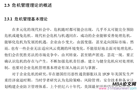 20 世紀 60 年代初,危機管理這一概念是由美國學者提出的,最初是被運用于外交、政治及軍事領(lǐng)域,作為一門學科,它是決策學的一個重要分支。20世紀 90 年代以后,伴隨經(jīng)濟全球化,企業(yè)的危機越來越復雜多樣,危機管理問題處理不當致使企業(yè)面臨生存危機的現(xiàn)實情況日益嚴峻,這使得國外學者對危機管理學科有了濃厚興趣。Dave Hall 指出,對企業(yè)內(nèi)部和外部環(huán)境的業(yè)務層開展客觀、系統(tǒng)的研究,以確定企業(yè)發(fā)生危機的類型[59]。在歐美發(fā)達國家,關(guān)于危機的論著中,危機管理一般被稱為危機溝通管理,這是因為由于加強信息流通和大眾的信賴,尋求大眾的理解和原諒是危機管理的基本方法。國外對這一課題研究比較早,所以大部分的企業(yè)有形成一定的危機管理意識。考慮危機本身的復雜多樣性等特點,為構(gòu)建更加完善的企業(yè)危機管理模式,需要通過理論與實踐反復驗證,才能得出更為科學合理的結(jié)論,所以學者或管理學者們不會停止對這一熱點課題更加深入全面的研究。歷史悠遠的中國古代就已有非常豐富的危機思想。“居安思危,思則有備,有備則無患”就是我國歷史上有名的危機觀念和意識。居安思危,要保持平時的高警惕性,這是一個有效的國家治理方法,古代中國人是古代祖先留下的智慧。特別是對于企業(yè)管理而言,危機感與時刻保持警惕性是現(xiàn)代企業(yè)可持續(xù)發(fā)展的關(guān)鍵。人們必須做好應對危機的準備,而不是束手無策的去應對,道理說明了危機管理的必要性。 雖然當時沒有提出形成專門的學術(shù)名稱,但古人的智慧已經(jīng)告訴我們,危機管理是很重要并且十分必要的。樹立好危機意識,防患于未然,不至于面臨危機時而不知所措,這樣也能把危機帶來的危害程度降到更低,更好的使企業(yè)渡過危機。