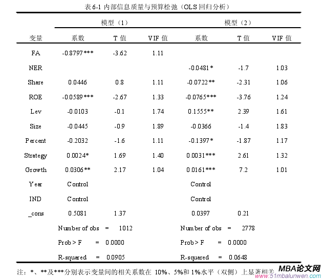 本文使用鄭石橋(2008)和趙靜(2012)計(jì)算預(yù)算松弛的方法對(duì)假設(shè) 1 進(jìn)行穩(wěn)健性檢驗(yàn),將預(yù)算松弛帶入模型(1)和模型(2)的右端進(jìn)行回歸,回歸結(jié)果如表 6-1 所示。模型(1)的 F 值在 1%的水平上顯著,R-squared 為 0.09,模型(2)的 F 值在 1%的水平上顯著,R-squared 為 0.065,模型可以較好解釋回歸結(jié)果。模型中各個(gè)變量的方差膨脹因子 VIF 均小于 2,說(shuō)明在模型中各個(gè)變量之間不存在多重共線性。業(yè)績(jī)預(yù)測(cè)準(zhǔn)確性的回歸系數(shù)為-0.8797,在 1%的水平上顯著負(fù)相關(guān),沒(méi)有因差錯(cuò)而導(dǎo)致財(cái)務(wù)報(bào)告重述的回歸系數(shù)為-0.0481。在 10%的水平上顯著負(fù)相關(guān),說(shuō)明在其他條件一定的情況下,內(nèi)部信息質(zhì)量越高,預(yù)算松弛程度越低,驗(yàn)證了假設(shè) 1。因此,穩(wěn)健性的檢驗(yàn)結(jié)果與上述回歸結(jié)果基本一致。