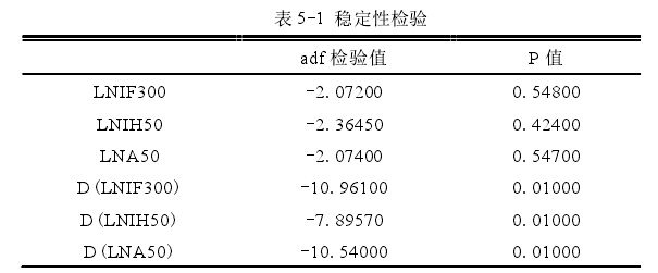 本文的研究標(biāo)的是在境外新加坡國(guó)際交易所上市的富時(shí) A50 指數(shù)期貨和境內(nèi)中國(guó)金融期貨交易所上市的滬深 300 指數(shù)期貨和上證 50 指數(shù)期貨。期貨價(jià)格使用連續(xù)的主力合約日收盤(pán)價(jià)格。本章節(jié)數(shù)據(jù)的選取時(shí)間段為 2015 年 4 月 16日到 2017 年 7 月 20 日。與其他基礎(chǔ)性的金融產(chǎn)品不一樣,期貨合約在上市的時(shí)候就規(guī)定了它的到期時(shí)間,如果期貨到期,合約就會(huì)取消,從而導(dǎo)致每一張合約會(huì)有間斷點(diǎn)。而且,同一天在市場(chǎng)上存在著多張到期日不同的期貨合約。所以,一個(gè)股指期貨品種在同一時(shí)間會(huì)有多個(gè)不同到期日合約的價(jià)格。如果要研究期貨價(jià)格的時(shí)間序列,我們需要對(duì)合約價(jià)格進(jìn)行處理:選取當(dāng)月的主力合約價(jià)格,當(dāng)合約進(jìn)入到期的交割月時(shí),選擇次月的合約價(jià)格,進(jìn)而得到一個(gè)沒(méi)有間斷點(diǎn)的期貨價(jià)格時(shí)間序列,并且這樣做還可以避免到期日效應(yīng)的影響。還有一點(diǎn)。由于境外交易所(新加坡國(guó)際交易所)的重大節(jié)假日休市制度與境內(nèi)交易所(中國(guó)金融期貨交易所)具有一定的差異,為了得到一一配對(duì)的價(jià)格數(shù)據(jù),本文對(duì)不匹配的數(shù)據(jù)進(jìn)行了刪減,從而取到 552 對(duì)富時(shí) A50 指數(shù)期貨和滬深 300 指數(shù)期貨的數(shù)據(jù)序列;同樣的,富時(shí) A50 指數(shù)期貨和上證 50 指數(shù)期貨的數(shù)據(jù)序列也是 552 對(duì)。(富時(shí) A50 指數(shù)期貨;滬深 300 指數(shù)期貨;上證 50 指數(shù)期貨的數(shù)據(jù)均取至文華財(cái)經(jīng)數(shù)據(jù)庫(kù))開(kāi)始正式的實(shí)證過(guò)程之前,我們先對(duì)三個(gè)股指期貨時(shí)間序列的穩(wěn)定性進(jìn)行了檢驗(yàn),并且考察了它們的基本統(tǒng)計(jì)性質(zhì)。(價(jià)格取對(duì)數(shù),分別為 LNA50、LNIF300、LNIH50;收益率為一階差分,分別是 D(LNA50), D(LNIF300),D(LNIH50))。穩(wěn)定性檢驗(yàn)如下表 5-1 所示;統(tǒng)計(jì)量如下表 5-2 所示。