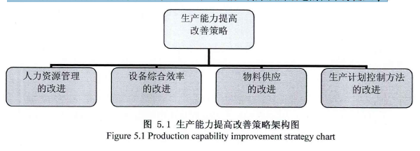 除了制定一個優(yōu)化的綜合生產(chǎn)計劃,如何從生產(chǎn)運營的各方面來確保綜合計劃的順利實施,以及如何通過對相關(guān)資源和約束的改進,提高整體產(chǎn)能使用效率來進一步優(yōu)化生產(chǎn)計劃系統(tǒng)和降低綜合制造成本。本文將主要從人、機、物、法等幾個生產(chǎn)管理的基本方面來研究具體產(chǎn)能效率改進的方法和策略,優(yōu)化系統(tǒng)運作以提高實際設(shè)備產(chǎn)能利用率。具體策略如下圖5.1的架構(gòu)圖所示,主要包括人力資源管理的改進、設(shè)備綜合效率的改進、物料供應(yīng)的改進和生產(chǎn)計劃控制方法的改進的四個方面入手。