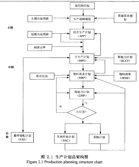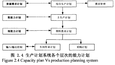 制定企業(yè)生產(chǎn)計劃時,核定生產(chǎn)能力是一項十分重要的工作,是實現(xiàn)企業(yè)生產(chǎn)計劃綜合平衡分析中的重要內(nèi)容。正確核定生產(chǎn)能力是企業(yè)經(jīng)營決策的前提,同時在生產(chǎn)能力的核定過程也能發(fā)現(xiàn)問題并實施改善。圖2.4表示了生產(chǎn)計劃系統(tǒng)框架中,各個層次的生產(chǎn)計劃與能力計劃模塊之間的關(guān)系。