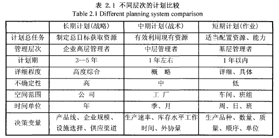 對于處于制造行業(yè)的企業(yè)來說,其生產(chǎn)經(jīng)營計劃涉及供應(yīng)、銷售、設(shè)備投資及維修、資金、成本控制、技術(shù)發(fā)展等多個領(lǐng)域,具有多目標(biāo)、多層次、多因素的特點。企業(yè)的各種計劃一般可以分為戰(zhàn)略層、戰(zhàn)術(shù)層和作業(yè)層三個層次。從計劃的時間跨度上來講,可分為長期計劃、中期計劃和短期計劃三個層次,這三個層次的計劃構(gòu)成一個完整的計劃體系。具體計劃的分類和特點,如表2.1和圖2.1所示: