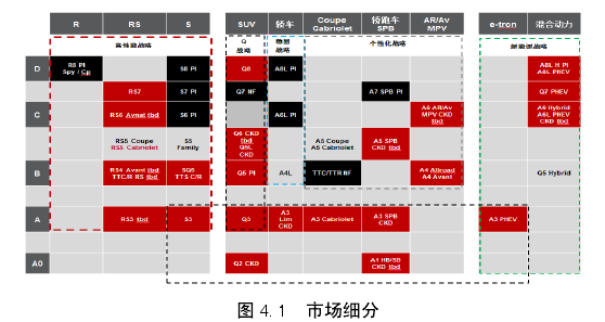 目前中國汽車市場主要分為超豪華車市場,如保時捷,賓利,瑪莎拉蒂等;豪華車市場,主流品牌有奧迪,寶馬,奔馳,路虎,沃爾沃等;以及普通乘用車市場,大眾,豐田,起亞等,以及眾多國產(chǎn)車品牌如奇瑞,吉利,長城等。市場細(xì)分通常按照用戶群體來劃分,而在汽車市場,不同的車輛級別和車身概念正是由不同的用戶群來劃分的,舉例來說,A級別的用戶可能個性時尚,年齡很小,追求潮流與個性;而D級別的用戶則多穩(wěn)重大氣,是成功人士的首選。奧迪屬于豪華車市場,將這一市場按照車輛級別以及車身概念來進(jìn)行市場細(xì)分,在車輛級別中如要以車輛的軸距尺寸作為衡量標(biāo)準(zhǔn),從A0級別一直到D級別,而從車身概念進(jìn)行細(xì)分,有SUV車型,轎車車型,Coupe/Cabriolet車型,Sportback轎跑車車型,Allroad/Avant旅行車,以及代表新能源的電動車車型和混合動力,以及高性能車型,對應(yīng)的車輛級別與對應(yīng)的車身概念相結(jié)合,即為某個車型所屬的細(xì)分市場。舉例來說,豪華A級別細(xì)分市場,主要由奧迪A3,寶馬1系,奔馳A級別進(jìn)行競爭;以及豪華D級別細(xì)分市場,主要代表產(chǎn)品奧迪A8,寶馬7系,奔馳S級別;同樣SUV市場也以A、B、C、D級別劃分,如豪華C級別SUV市場,主要競品為奧迪Q7,寶馬X5,奔馳GLE;而像奧迪A5Coupe車型,從車身級別上屬于B級車,從車身概念屬于Coupe概念,則A5Coupe車型則屬于B級Coupe細(xì)分市場(如下圖所示)。