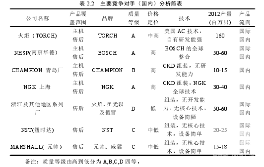 (2)對湘火炬火花塞內(nèi)部資源和經(jīng)營現(xiàn)狀的分析和評價,確定了競爭優(yōu)勢在于生產(chǎn)類別齊全,研發(fā)能力較強,生產(chǎn)規(guī)模大,較低的成本制造等。而劣勢則主要是管理水平與國際巨頭相比有待提升,設(shè)備工程、質(zhì)量保證能力與世界最好還有差距,復(fù)合型營銷人才缺乏,海外經(jīng)驗缺乏等。