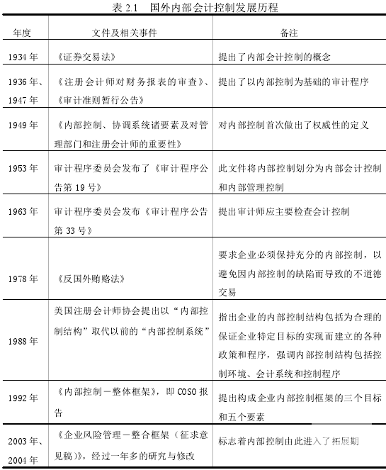 國(guó)外內(nèi)部會(huì)計(jì)控制發(fā)展起步早,經(jīng)過(guò)多年的發(fā)展,內(nèi)部會(huì)計(jì)控制發(fā)展相對(duì)成熟,其歷程如下表 2.1 所示,