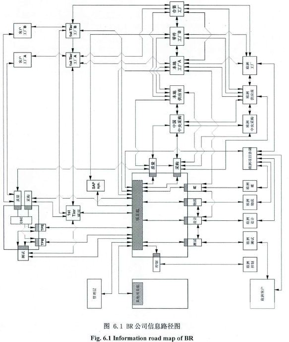 如圖中所示整個(gè)供應(yīng)鏈體系都被涵蓋在整張圖中。從縱向角度看這張圖包括了從下游的客戶,一階供應(yīng)商到BR公司項(xiàng)目團(tuán)隊(duì)到下游供應(yīng)商。從橫向角度看客戶端包括中國客戶和歐洲客戶以及相應(yīng)的總裝廠,BR公司同樣也包括中國項(xiàng)目組、歐洲協(xié)調(diào)人和相應(yīng)的工廠,同時(shí)還包括了平行的其他項(xiàng)目和數(shù)據(jù)系統(tǒng)。另外這幅圖還表明了項(xiàng)目組織的構(gòu)成關(guān)系,比如圖中的中國項(xiàng)目組就是有項(xiàng)目經(jīng)理、銷售、質(zhì)量、IE、設(shè)計(jì)、測試、物流以及釆購等等的職能部門成員組成的。圖中的每一條連線都代表了一個(gè)業(yè)務(wù)關(guān)系,在每個(gè)業(yè)務(wù)關(guān)系的兩端就是項(xiàng)目干系人(這里SAP系統(tǒng)也屬于項(xiàng)目干系人)。根據(jù)這些連線就可以識別到對應(yīng)的項(xiàng)目干系人,根據(jù)每條信息路線又可以確定出具體的業(yè)務(wù)流程。