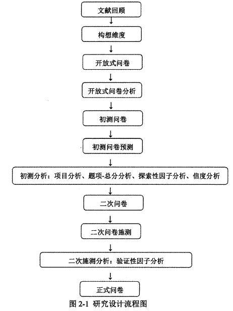 文獻回顧國內(nèi)外相關(guān)領(lǐng)導(dǎo)力的思想、理論,以及開放式問卷收集大學(xué)生領(lǐng)導(dǎo)力的表現(xiàn)形式,提取出相關(guān)的題項,構(gòu)成大學(xué)生領(lǐng)導(dǎo)力初步問卷。通過對問卷的初步施測和對測量結(jié)果統(tǒng)計,確定大學(xué)生領(lǐng)導(dǎo)力結(jié)構(gòu),并形成正式問卷。最后,正式施測,分析了解大學(xué)生領(lǐng)導(dǎo)力的現(xiàn)狀。詳細研究設(shè)計見下圖2-1。
