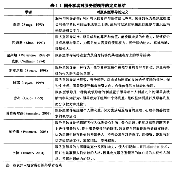 ?對服務(wù)型領(lǐng)導(dǎo)的定義由兩部分組成:對領(lǐng)導(dǎo)的定義和對服務(wù)的定義。對前者大家的認(rèn)識比較統(tǒng)一,但對領(lǐng)導(dǎo)應(yīng)該如何服務(wù)的問題,每個人卻有著不同的理解。后來的學(xué)者根據(jù)自己所處的社會環(huán)境、自己對服務(wù)的理解和研究對象的不同對服務(wù)型領(lǐng)導(dǎo)概念進(jìn)行了各自的闡述。通過查閱文獻(xiàn),我們將國外和國內(nèi)學(xué)者對服務(wù)型領(lǐng)導(dǎo)定義匯總成表1-1。