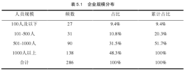 ?企業(yè)的員工人數(shù)是管理學(xué)研究中重點關(guān)心的企業(yè)特征之一,并被認(rèn)為是反映企業(yè)規(guī)模的重要指標(biāo)。本研究的調(diào)研樣本具有較大的分散性,包括了各種類型的企業(yè)人員,如表 5.1所示,100 人以下的企業(yè)占比 9.4%,101-500 人的企業(yè)占比 10.8%,501-1000 人的企業(yè)占比31.5%,1000 人以上的企業(yè)占比 48.3%。