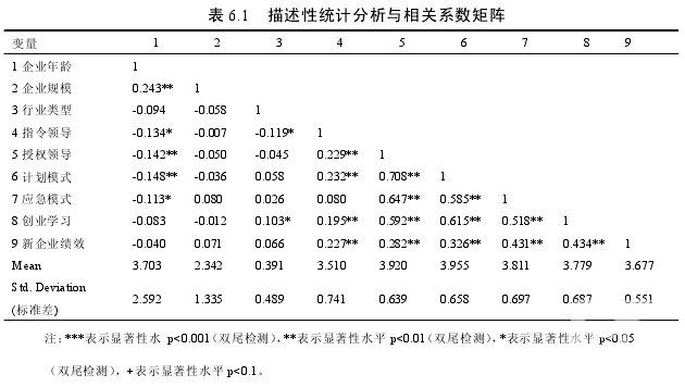 本研究在對(duì)數(shù)據(jù)進(jìn)行多元線性回歸分析之前,先對(duì)文中所涉及的主要變量進(jìn)行簡(jiǎn)單描述性統(tǒng)計(jì)和 Pearson 相關(guān)分析,結(jié)果如下表 6.1 所示。表 6.1 的數(shù)據(jù)顯示,各個(gè)變量的均值和方差都處于合理范圍內(nèi)。并且,Pearson 相關(guān)分析結(jié)果顯示,創(chuàng)業(yè)者領(lǐng)導(dǎo)行為(指令領(lǐng)導(dǎo)和授權(quán)領(lǐng)導(dǎo))和戰(zhàn)略形成(計(jì)劃模式和應(yīng)急模式)存在相關(guān)性,戰(zhàn)略形成(計(jì)劃模式和應(yīng)急模式)與新企業(yè)績(jī)效存在相關(guān)性,這初步表明了這些變量間存在關(guān)系。