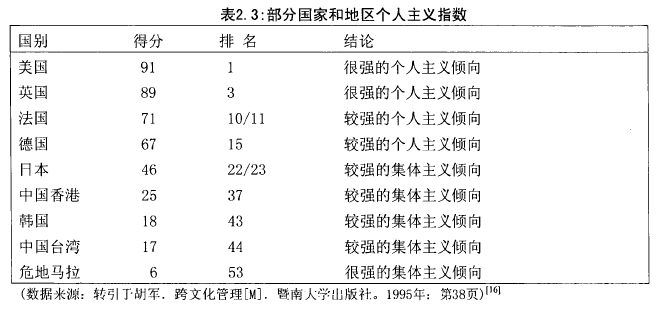 個(gè)體主義與集體主義是指人們對(duì)待集體和個(gè)人關(guān)系的傾向,即重視個(gè)人還是集體。我們可以用個(gè)人主義指數(shù)來衡量一個(gè)社會(huì)的個(gè)人主義或集體主義傾向。指數(shù)越大,說明該社會(huì)的個(gè)人主義傾向越明顯;反之則說明該社會(huì)的集體主義傾向越明顯。這個(gè)維度也很能很好地說明文化差異的問題。例如,中國的個(gè)人主義指數(shù)比較低,一直強(qiáng)調(diào)群體至上,注重人與人之間的關(guān)系融合。而歐美國家的個(gè)人主義指數(shù)較高,他們不大贊成在工作單位結(jié)成人與人之間的親密關(guān)系。表2.3是部分國家或地區(qū)個(gè)人主義指數(shù)統(tǒng)計(jì):