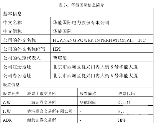 公司成立于 1994 年 6 月 30 日,采取國內(nèi)外合資形式,主要經(jīng)濟(jì)活動是投資開發(fā)和經(jīng)營大規(guī)模發(fā)電廠。公司擁有大量現(xiàn)代化設(shè)備,生產(chǎn)技術(shù)先進(jìn),于 1994 年 10月,以 3,125 萬股美國存托股份(“ADS”)在美國紐約證券交易所上市(代碼:HNP)。2001 年 11 月,公司以 3.5 億股 A 股(代碼:600011)成功在上海證券交易所上市,其中包含 2.5 億股社會公眾股。目前,公司在境內(nèi)和境外發(fā)行的總股本約有 140.6 億股。整理信息見表 2-1。