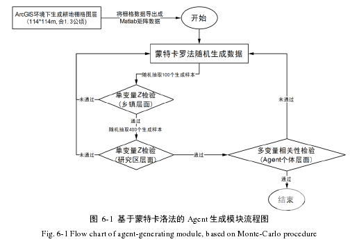 Agent 生成模塊主要由兩步串聯(lián)的步驟構(gòu)成:第一,利用蒙特卡洛發(fā)隨機生成所有 Agent各個因素(變量)的具體值(具體方法見 5.3.1部分),數(shù)據(jù)生成的關鍵統(tǒng)計量(如均值、方差等)根據(jù)村層面的調(diào)查樣本參數(shù)進行設定。第二,對生成的變量值做多尺度統(tǒng)計檢驗。統(tǒng)計檢驗具體包括單變量參數(shù)檢驗與多變量相關性檢驗兩方面內(nèi)容,參考 Berger and Schreinemachers(2006)的檢驗準則,單變量參數(shù)檢驗將在總體層次(即整個研究區(qū)域)與聚類層次(即鄉(xiāng)鎮(zhèn)層)開展,而多變量相關性檢驗將在 Agent 個體層次開展。隨機數(shù)的生成需要通過所有檢驗,否則 Agent 生成模塊將重新運轉(zhuǎn),直至生成的所有變量值符合標準為止(圖 6-1)。