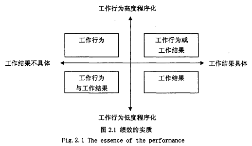 鑒于上述分析,可以看出將績效籠統(tǒng)地定義為工作結(jié)果、員工行為或者員工素質(zhì)的觀點都是片面的。對于不同的企業(yè)、企業(yè)發(fā)展的不同階段以及不同類型的工作,在進行績效考核時,可以根據(jù)具體情況強調(diào)績效的某一方面內(nèi)涵。例如,當某項工作的程序化程度較高且易于觀察時,績效可以被看作是員工工作行為,如公司行政人員;當某項工作的工作成果比較具體且能夠真實體現(xiàn)員工工作的努力程度時,績效可以被看作是工作結(jié)果,如專業(yè)咨詢?nèi)藛T;當某項工作的程序化程度較髙且工作結(jié)果具體時,工作行為和工作結(jié)果都能夠反映員工的工作績效,如中學(xué)教師;當工作的程序化程度較低,工作結(jié)果不具體且受外界影響大時,工作行為和工作結(jié)果從不同角度反映員工的工作績效,因此需要對員工工作行為和結(jié)果進行綜合評價,如研發(fā)人員。工作類型和績效的對應(yīng)關(guān)系具體如圖2.1所示