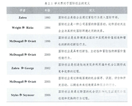國(guó)際創(chuàng)業(yè)領(lǐng)域的研究,最早可追溯到20世紀(jì)80年代,Morrow于1988年率先提出了 “國(guó)際創(chuàng)業(yè)”這一概念,而McDougall (1989)首先對(duì)其進(jìn)行了定義:“國(guó)際創(chuàng)業(yè)是指從成立初就開(kāi)展國(guó)際化運(yùn)營(yíng)的國(guó)際新創(chuàng)企業(yè)的發(fā)展過(guò)程。”此后,隨著更多的學(xué)者參與到相關(guān)研究中,對(duì)于國(guó)際創(chuàng)業(yè)的定義也不斷豐富(如表2.1),研究的范疇也進(jìn)一步明確。McDougall ( 1989)通過(guò)對(duì)新創(chuàng)企業(yè)海外銷售活動(dòng)的實(shí)證研究,首次揭示了國(guó)際新創(chuàng)企業(yè)與傳統(tǒng)企業(yè)之間的區(qū)別。Zahra (1993)隨后提出,國(guó)際創(chuàng)業(yè)的研究對(duì)象應(yīng)該同時(shí)包括新創(chuàng)企業(yè)和成熟企業(yè)。在Wright和Ricks (1994)對(duì)于國(guó)際創(chuàng)業(yè)的定義中,公司年齡或者國(guó)際化時(shí)點(diǎn)不再是界定國(guó)際創(chuàng)業(yè)的唯一標(biāo)準(zhǔn),同時(shí)他們還認(rèn)為年輕的新創(chuàng)企業(yè)和成熟企業(yè)都具有研究的價(jià)值。他們強(qiáng)調(diào)了企業(yè)環(huán)境對(duì)于激發(fā)特定創(chuàng)業(yè)行為的重要作用,并且將創(chuàng)業(yè)行為的跨國(guó)比較也納入到了國(guó)際創(chuàng)業(yè)的研究范疇。McDougall和Oviatt (2000)對(duì)于國(guó)際創(chuàng)業(yè)的定義回歸了Miller(1983)對(duì)于創(chuàng)業(yè)的定義,即強(qiáng)調(diào)了國(guó)際創(chuàng)業(yè)是公司層面的一種具有創(chuàng)新性、主動(dòng)性和冒險(xiǎn)性的行為。這使得對(duì)于國(guó)際創(chuàng)業(yè)的研究可以借鑒并延續(xù)創(chuàng)業(yè)領(lǐng)域的某些研究成果,同時(shí)也將大企業(yè)創(chuàng)業(yè)(Corporate entrepreneurship)包括在國(guó)際創(chuàng)業(yè)的研究范疇中。Zahra和George (2002)借鑒創(chuàng)業(yè)領(lǐng)域的研究成果(Shane和Venkataraman, 2000; Zahra和Dess, 2001),首次從創(chuàng)業(yè)機(jī)會(huì)的視角定義了國(guó)際創(chuàng)業(yè),將國(guó)際創(chuàng)業(yè)視為企業(yè)通過(guò)對(duì)海外創(chuàng)業(yè)機(jī)會(huì)的識(shí)別、開(kāi)發(fā)和利用以實(shí)現(xiàn)國(guó)際化的過(guò)程。他們還指出過(guò)去的國(guó)際創(chuàng)業(yè)研究過(guò)于專注國(guó)際新創(chuàng)企業(yè),而對(duì)于成熟企業(yè)開(kāi)展的跨國(guó)創(chuàng)業(yè)行為缺少關(guān)注。他們認(rèn)為正是由于企業(yè)創(chuàng)業(yè)行為和國(guó)際化過(guò)程之間的交叉,特別是企業(yè)在國(guó)際化過(guò)程中所采取的創(chuàng)新性和冒險(xiǎn)性行為,使得國(guó)際創(chuàng)業(yè)成為了獨(dú)立于企業(yè)國(guó)際化的特殊研究領(lǐng)域。借鑒他們的視角,McDougall和Oviatt在2005年重新定義了國(guó)際創(chuàng)業(yè),提出國(guó)際創(chuàng)業(yè)的實(shí)施對(duì)象并不應(yīng)局限于國(guó)際新創(chuàng)企業(yè),也包括成熟企業(yè),同時(shí),更加明確了國(guó)際創(chuàng)業(yè)中的“創(chuàng)業(yè)”特征,強(qiáng)調(diào)了對(duì)“機(jī)會(huì)”關(guān)注,從而與傳統(tǒng)的企業(yè)國(guó)際化研究相區(qū)別,并明確提出國(guó)際創(chuàng)業(yè)的研究應(yīng)包括兩個(gè)方面的內(nèi)容:對(duì)于企業(yè)“創(chuàng)業(yè)型”國(guó)際化的研究(Entrepreneurial internationalization)和對(duì)于創(chuàng)業(yè)活動(dòng)的跨國(guó)比較研究(Comparative studies of entrepreneurship across national borders)。