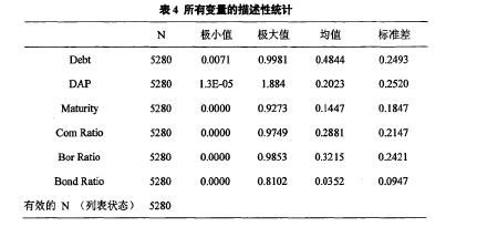 本文采用修正的Jones模型計(jì)量盈余管理的程度,由于該模型的計(jì)量需要至少三年的數(shù)據(jù),為了計(jì)算2011-2013滬深A(yù)股上市公司的盈余管理程度,收集了2010-2013四年的數(shù)據(jù),采用SPSS20.0分年度進(jìn)行回歸,回歸結(jié)果如表3所示:將上述模型中的回歸系數(shù)帶入計(jì)算出所有樣本公司的盈余管理程度,即DAP,同時(shí)收集所有樣本公司的負(fù)債比率、長(zhǎng)期債務(wù)比率、商業(yè)信用比例、銀行貸款比例以及債券比例等解釋變量的基礎(chǔ)數(shù)據(jù),并進(jìn)行描述性統(tǒng)計(jì),通過(guò)對(duì)變量的描述性統(tǒng)計(jì)我們可以看出,Debt的均值為48.44%,說(shuō)明上市公司的整體負(fù)債率很高,公司資產(chǎn)的一半由債權(quán)人提供,債權(quán)人承擔(dān)較大的風(fēng)險(xiǎn)。DAP的極小值和極大值差別很大,說(shuō)明各個(gè)公司間盈余管理的程度差異很大。同時(shí),通過(guò)對(duì)債務(wù)融資結(jié)構(gòu)的描述性統(tǒng)計(jì)可以看出,銀行借款依然作為當(dāng)前企業(yè)債務(wù)融資的重要來(lái)源,均值達(dá)到32.15%,其次是商業(yè)信用,均值達(dá)到28.81%。對(duì)于債券融資,由于其發(fā)行條件較為奇刻,且債券市場(chǎng)還未成熟,在中國(guó)市場(chǎng)上以發(fā)行債券作為債務(wù)融資的企業(yè)尚且較少,因此當(dāng)前在債務(wù)融資中所占的比例較小。