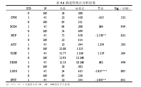 為了檢驗(yàn)所選取的變量的顯著性,對(duì)各個(gè)變量的均值進(jìn)行了 T 檢驗(yàn),表 5.1 列示了檢驗(yàn)的結(jié)果。本文對(duì) T 檢驗(yàn)的結(jié)果做了具體的分析:本文所選取的三個(gè)自變量董事長(zhǎng)與總經(jīng)理的兼任情況(CFM)、是否是“四大”事務(wù)所(BIG4)、是否納入實(shí)施范圍(NSF)中,只有是否納入實(shí)施范圍(NSF)這個(gè)變量的 T 值通過了顯著性檢驗(yàn),并且方向與預(yù)期的一致,即越是納入實(shí)施范圍的公司,其披露財(cái)務(wù)報(bào)告內(nèi)部控制缺陷的概率越大;其余兩個(gè)變量的 T 值均沒有通過顯著性檢驗(yàn)。在本文所選取的控制變量中,營(yíng)業(yè)利潤(rùn)(LOSS)和是否 ST(IFST)這兩個(gè)控制變量的 T 值通過了顯著性檢驗(yàn),并且符號(hào)與預(yù)期的一致,說明了當(dāng)公司經(jīng)營(yíng)狀況不佳時(shí),其內(nèi)部控制出現(xiàn)漏洞的可能性更大。其余的自變量和控制變量的 T 值并沒有通過顯著性檢驗(yàn),具體原因?qū)⒃诤笪牡腖ogistic 回歸結(jié)果的分析中給出。T 檢驗(yàn)只是對(duì)假設(shè)的初步檢驗(yàn),具體的應(yīng)該看最終的邏輯回歸的結(jié)果。通過表格可以看出,本文所選取的虛擬變量:是否 ST(IFST)、是否是“四大”事務(wù)所(BIG4)、是否納入實(shí)施范圍(NSF)、事務(wù)所變更(AUC)、營(yíng)業(yè)利潤(rùn)(LOSS)、董事長(zhǎng)與總經(jīng)理的兼任情況(CFM)的初始取值全都都發(fā)生了變化,即原來的 0 改用 1 表示,原來的 1改用 0 表示。記住這個(gè)分類對(duì)后面的回歸結(jié)果的分析非常的重要,因?yàn)槲以谧x文獻(xiàn)的過程中發(fā)現(xiàn)許多學(xué)者在他們的研究中把這一點(diǎn)給忽略了,導(dǎo)致了結(jié)果的分析錯(cuò)誤,即 T 檢驗(yàn)的結(jié)果和 Logistic 的結(jié)果相互矛盾,這點(diǎn)是我們?cè)谝院蟮难芯恐袘?yīng)該注意的。