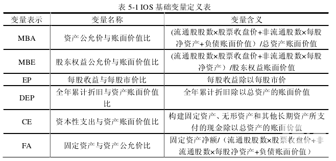 通過第三章對(duì)相關(guān)概念的界定,我們知道投資機(jī)會(huì)集是衡量企業(yè)面臨投資機(jī)會(huì)多寡的一個(gè)綜合性指標(biāo)。一些國外學(xué)者通過選用幾個(gè)相關(guān)指標(biāo)來表示企業(yè)的投資機(jī)會(huì)集,再運(yùn)用因子分析方法進(jìn)行計(jì)算。因子得分?jǐn)?shù)值較高的企業(yè)表示企業(yè)富有投資機(jī)會(huì),較低的表示企業(yè)缺乏投資機(jī)會(huì)。選取滯后一期的 MBA、MBE、EP、DEP、CE 與 FA 六個(gè)變量作用構(gòu)成投資機(jī)會(huì)集的基礎(chǔ)變量,通過因子分析,求得公共因子,以此衡量公司的成長(zhǎng)性。表 5-1,表 5-2 分別給出各變量的定義說明、描述性統(tǒng)計(jì)和相關(guān)系數(shù)。 表5-2顯示的是投資機(jī)會(huì)集的6個(gè)基礎(chǔ)變量的描述性統(tǒng)計(jì)和相關(guān)性分析結(jié)果,利用因子分析方法對(duì)這 6 個(gè)基礎(chǔ)變量進(jìn)行處理,最終從 6 個(gè)變量中提取出主要信息構(gòu)成投資機(jī)會(huì)集的代理變量 IOS。用 IOS 表企業(yè)面臨的投資機(jī)會(huì)。