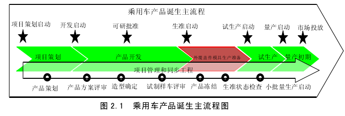 生產(chǎn)準備管理的主要內(nèi)容是在保證產(chǎn)品符合設計的前提下,進行合理的資源利用、物流規(guī)劃、成本控制、技術裝備、工藝制造方法、人員配備等準備工作,使產(chǎn)品制造能力和質(zhì)量達到設計要求的全部過程。由于本文主要是以 YQJC公司為背景,故其自主品牌產(chǎn)品開發(fā)過程中的沖壓工藝生產(chǎn)準備管理主要有以下幾個主要內(nèi)容: 1、生產(chǎn)準備 BOM:也稱為工藝制造設計零件明細表。它用于工藝設計和生產(chǎn)制造管理,使用它可以明確地了解零件與零件之間的匹配關系。 2、白車身匹配活動(PCF-Product Content Fix):為滿足白車身尺寸精度標準,通過對白車身零(合)件進行匹配,達到白車身尺寸精度標準,而進行的質(zhì)量培育過程。 3、整車匹配活動(UCF-Unit Content Fix):為滿足整車尺寸精度標準,通過對總裝零(合)件進行匹配,達到整車尺寸精度標準,而進行的質(zhì)量培育過程。 4、試生產(chǎn)(TTO-Tooling Try Out):工藝調(diào)試,安排在 PP 生產(chǎn)之前。主要任務是利用單件和總成工裝來檢驗工序及設備的工藝能力,通過調(diào)試達到質(zhì)量目標,同時起到培訓操作者及檢查員操作能力的作用。 5、小批量生產(chǎn)(PP-Pilot Production):工藝調(diào)試完畢之后,正式生產(chǎn)前,在正式工裝條件下的批量試生產(chǎn)階段。主要任務是:檢驗零件的供貨能力、檢驗質(zhì)量穩(wěn)定性、檢驗設備通過能力、設備、工裝優(yōu)化、工藝文件定稿。 6、量產(chǎn)(MP- Mass Production):根據(jù)生產(chǎn)計劃生產(chǎn)大批量的產(chǎn)品。下圖2.1 為外覆蓋沖壓件模具生產(chǎn)準備在乘用車產(chǎn)品誕生主流程里所處的位置: