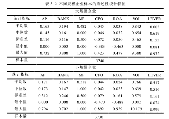 對近十年樣本數(shù)據(jù)中的變量做初步的統(tǒng)計(jì)分析,結(jié)果如下表: 表 5-1 分別從平均數(shù)、中位數(shù)、標(biāo)準(zhǔn)差、最大值和最小值五個(gè)方面對各變量進(jìn)行統(tǒng)計(jì)性分析。商業(yè)信用(AP)的平均數(shù)為 0.182,中位數(shù)為 0.154,說明我國上市公司獲取商業(yè)信用的平均水平較高,從圖  5-1  中可以看出主要分布在0 到 0.2 之間,雖然最大值為 0.794,最小值為 0,差距比較大,但是分布比較集中。銀行信用(BANK)的平均數(shù)為 0.174,中位數(shù)為 0.159,其最大值為 0.800,最小值為 0,從圖 5-2 中可以看出數(shù)值集中分布在 0-0.2 之間,與商業(yè)信用(AP)相比,銀行信用(BANK)的平均數(shù)低 0.008,說明商業(yè)信用在企業(yè)經(jīng)營性融資中占有重要的地位??幢?5-2,一是商業(yè)信用融資額,大規(guī)模企業(yè)的商業(yè)信用獲得額是 0.163,大規(guī)模企業(yè)商業(yè)信用獲得額是 0.171,說明小規(guī)模企業(yè)應(yīng)付款項(xiàng)占總資產(chǎn)比例的平均值比大規(guī)模企業(yè)高 0.8 個(gè)百分點(diǎn);二是企業(yè)銀行信用變量,大規(guī)模企業(yè)銀行短期信貸的使用量是 0.194,小規(guī)模企業(yè)銀行短期信貸的使用量是 0.167,說明大規(guī)模企業(yè)的銀行短期信用占總資產(chǎn)比例均值比小規(guī)模企業(yè)高 2.7 個(gè)百分點(diǎn),這表明大規(guī)模企業(yè)比大規(guī)模企業(yè)更容易獲得短期信貸,此外,大規(guī)模企業(yè)的短期銀行信用獲取變量的標(biāo)準(zhǔn)差小于小規(guī)模企業(yè),說明大規(guī)模企業(yè)信貸存量的分布波動(dòng)相對較小,而小規(guī)模企業(yè)信貸存量的分布波動(dòng)相對較大,說明小規(guī)模企業(yè)依賴于不穩(wěn)定的短期信貸,資金約束較為嚴(yán)重;三是企業(yè)特性變量,大規(guī)模企業(yè)的盈利能力均值是 0.038,小規(guī)模企業(yè)的盈利能力均值是 0.024,大規(guī)模企業(yè)比小規(guī)模企業(yè)高 1.4 個(gè)百分點(diǎn),標(biāo)準(zhǔn)差低 11.1 個(gè)百分點(diǎn),表明小規(guī)模企業(yè)的盈利能力參差不齊,經(jīng)營業(yè)績隨時(shí)間波動(dòng)較大,且相較于大規(guī)模企業(yè),其盈利能力較弱,具有高風(fēng)險(xiǎn)低收益的特點(diǎn)。大規(guī)模企業(yè)的營運(yùn)能力均值是 0.843,小規(guī)模企業(yè)的營運(yùn)能力均值是 0.766,大規(guī)模企業(yè)比小規(guī)模企業(yè)高 1.77 個(gè)百分點(diǎn),表明大規(guī)模企業(yè)的資產(chǎn)周轉(zhuǎn)要比小規(guī)模企業(yè)快。