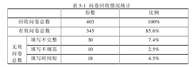 對于樣本的整體回收情況,前文提到共回收 403 份問卷,其中有效問卷 345份,剔除的無效問卷 58 份,剔除的問卷主要是多選、漏選、所有題目均是同一選項以及網(wǎng)絡問卷中填寫時間過快等幾種情況。 對樣本的人口特征進行描述性統(tǒng)計分析是對于被訪者的基本情況以及研究的變量和選項內容進行頻率、平均數(shù)以及標準差的統(tǒng)計分析,以便于了解樣本的整體分布情況,驗證樣本來源與分布的科學性與合理性。