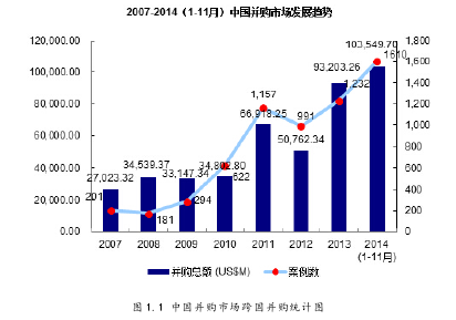 現(xiàn)代企業(yè)的發(fā)展主要通過(guò)內(nèi)部成長(zhǎng)和外部擴(kuò)張兩張方式,這兩種方式比較而言,外部擴(kuò)張更具有時(shí)間和成本上的優(yōu)勢(shì),能夠在短期內(nèi)迅速擴(kuò)大企業(yè)規(guī)模,實(shí)現(xiàn)規(guī)模效應(yīng)。因此,并購(gòu)作為企業(yè)外部擴(kuò)張的主要途徑,對(duì)促進(jìn)企業(yè)優(yōu)化資源配置和實(shí)現(xiàn)規(guī)模經(jīng)濟(jì)方面有著重要作用。隨著經(jīng)濟(jì)全球化和國(guó)家“走出去”戰(zhàn)略的推廣,從 2013 年開始,我國(guó)跨國(guó)并購(gòu)事件就日益頻繁發(fā)生。據(jù)統(tǒng)計(jì),截至 2014年 11 月,我國(guó)市場(chǎng)共發(fā)生 164 起跨國(guó)并購(gòu)事件,同比增長(zhǎng) 47.7%,其中披露金額的事件有 143 起,涉及的并購(gòu)交易額共 340.84 億美元,同比下降 22.7%。1下圖統(tǒng)計(jì)了我國(guó)并購(gòu)市場(chǎng) 2007 年——2014 年跨國(guó)并購(gòu)的案例數(shù)和交易總額,可以看出 2013 年在交易金額規(guī)模方面出現(xiàn)了大幅增長(zhǎng),主要是由于我國(guó)國(guó)內(nèi)市場(chǎng)趨于飽和,企業(yè)“走出去”和資本輸出已成為必然趨勢(shì)。而 2014 年金額規(guī)模方面較 2013 年出現(xiàn)了小幅下降,究其原因在于我國(guó)企業(yè)雖然急于開拓海外市場(chǎng),獲取先進(jìn)技術(shù)和吸收高素質(zhì)人才,但是法律、文化、管理等方面的差異使得并購(gòu)后 期的整合問題困難重重,因此跨國(guó)并購(gòu)活動(dòng)在 2013 年的跨越式增長(zhǎng)之后規(guī)模開始趨于謹(jǐn)慎。 從并購(gòu)行業(yè)分布來(lái)看,2014 年我國(guó)并購(gòu)市場(chǎng)共發(fā)生了 1610 起并購(gòu)事件,分別發(fā)生在房地產(chǎn)、機(jī)械制造、生物科技、電子設(shè)備、礦產(chǎn)及能源、IT 等二十多個(gè)行業(yè)。其中由于 2014 年有些地區(qū)房市不景氣、房?jī)r(jià)出現(xiàn)下跌趨勢(shì),房地產(chǎn)行業(yè)業(yè)內(nèi)加速洗牌,導(dǎo)致房地產(chǎn)行業(yè)發(fā)生并購(gòu)事件最多,有 166 起居第一,在總數(shù)中占 10.3%;然后機(jī)械制造行業(yè)緊隨其后,位居第二,共發(fā)生 144 起,總占比達(dá)8.9%。22014 年 7 月,就《上市公司重大資產(chǎn)重組管理辦法》、《上市公司收購(gòu)管理辦法》證監(jiān)會(huì)向社會(huì)征求修訂意見,此舉對(duì)于上市公司產(chǎn)業(yè)升級(jí)和行業(yè)整合,以及推動(dòng)并購(gòu)市場(chǎng)的發(fā)展有重要作用。在此背景下,我國(guó)部分上市公司為了應(yīng)對(duì)市場(chǎng)的激烈競(jìng)爭(zhēng)和產(chǎn)能過(guò)剩問題,積極并購(gòu)新興行業(yè)達(dá)到跨界轉(zhuǎn)型的目的,從而實(shí)現(xiàn)市場(chǎng)價(jià)值和業(yè)績(jī)的增長(zhǎng)。