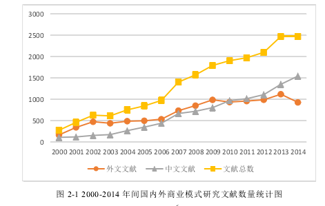 基于對(duì)文獻(xiàn)檢索平臺(tái)的權(quán)威性及其對(duì)數(shù)據(jù)庫與期刊的涵蓋率等因素的考慮,本文選取“ISI Web of Science”作為英文文獻(xiàn)檢索平臺(tái),選取“中國知網(wǎng)”(CNKI)作為中文文獻(xiàn)檢索平臺(tái),以“商業(yè)模式(Business Model)”為主題詞,時(shí)間跨度為2000 年到 2014 年,共檢索到文獻(xiàn) 20269 篇,其中外文文獻(xiàn) 10464 篇,中文文獻(xiàn)9805 篇。根據(jù)檢索結(jié)果,繪制出 2000-2014 年間國內(nèi)外商業(yè)模式研究文獻(xiàn)數(shù)量統(tǒng)計(jì)圖(圖 2-1),從圖 2-1 中可以看到,關(guān)于商業(yè)模式的研究成果在這十幾年間飛速增加,從 2000 年的 276 篇上升到 2014 年的 2475 篇。對(duì)比外文文獻(xiàn)和中文文獻(xiàn)的折線圖可以發(fā)現(xiàn),國內(nèi)對(duì)商業(yè)模式的研究滯后于國外,但從 2010 年開始,國內(nèi)每年關(guān)于商業(yè)模式的文獻(xiàn)數(shù)量已經(jīng)超過了國外,至于質(zhì)量如何需要進(jìn)一步地分析。此外,觀察外文文獻(xiàn)數(shù)量的折線圖可以發(fā)現(xiàn),從 2009 年開始,國外每年關(guān)于商業(yè)模式的文獻(xiàn)數(shù)量保持穩(wěn)定,說明國外對(duì)于商業(yè)模式的研究開始進(jìn)入冷靜期。