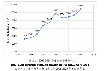 根據(jù) 2015 年《中國保險統(tǒng)計年鑒》數(shù)據(jù)顯示,2014 年壽險業(yè)務原保險保費收入10901.69 億元,同比增長 15.67%。其中,普通壽險保費收入 4296.5 億元,同比增長 258%,保費占比 33.9%;分紅保險保費收入 6508.8 億元,同比下降 20%,保費占比 51.3%,改變了分紅險一險獨大的局面,一舉扭轉了改革前行業(yè)新單負增長、總保費收入增速低于GDP 增速的局面?,F(xiàn)將 2005-2014 十年的壽險業(yè)務保費收入制成如下柱狀圖,如圖 2-1所示。2014 年,壽險公司銀郵代理業(yè)務原保險保費收入 4946.90 億元,同比增長 25.55%,占壽險公司業(yè)務總量的 38.98%,同比上升 2.30 個百分點;個人代理業(yè)務原保險保費收入 6175.20 億元,同比增長 12.36%,占壽險公司業(yè)務總量的 48.66%,同比下降 2.51 個百分點;公司直銷業(yè)務原保險保費收入 1268.26 億元,同比增長 23.55%,占壽險公司業(yè)務總量的 9.99%,同比上升 0.44 個百分點。2014 年,壽險公司退保金 3239.05 億元,同比增長 69.89%。退保率 5.62%,比去年同期增加 1.82 個百分點。分不同性質公司看,中資壽險公司退保金 3166.97 億元,退保率 5.75%;外資壽險公司退保金 72.08 億元,退保率 2.85%。