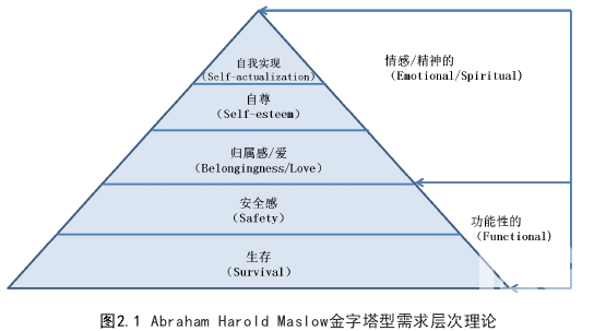 用戶體驗歸根到底還是一種心理感受,它與用戶消費行為存在著強相關(guān),而談到用戶消費行為則不能不提馬斯洛的需求層次理論。美國心理學(xué)家 AbrahamHarold Maslow(1943)在《人類激勵理論》論文中提出人類需求象階梯一樣從低到高按層次分為五種,分別是:生存需求(survival)、安全需求(safety)、社交需求—歸屬感/愛(Belongingness/Love)、尊重需求(Slef-esteem)和自我實現(xiàn)需求(Self-actualization)。 功能性的底層需求相對較為基礎(chǔ)和穩(wěn)定,而用戶體驗屬于情感/精神層面的需求,是較高層次的需求。Abraham Harold Maslow金字塔型需求層次理論見圖 2.1?;隈R斯洛的需求層次理論,李小青(2010) 在《基于普遍心理分層理論的Web 用戶體驗?zāi)P驮O(shè)計》的論文中提出了基于用戶心理研究的WEB用戶體驗?zāi)P?。其認(rèn)為人們認(rèn)識事物要經(jīng)過本能層、行為層和反思層的處理過程。本能層的用戶體驗與感知系統(tǒng)相聯(lián)系,正如用戶“本能”,這部分是最直接最原始的用戶感受。因此與網(wǎng)站展現(xiàn)給用戶的最表層的視覺設(shè)計和界面設(shè)計關(guān)聯(lián)。行為層的用戶體驗與網(wǎng)站的交互設(shè)計和功能設(shè)計關(guān)聯(lián),顧名思義,與用戶在使用網(wǎng)站時的相關(guān)行為有關(guān),表現(xiàn)為以用戶目標(biāo)為驅(qū)動的一系列的用戶行為。反思層的用戶體驗位于模型的最高層,并不直接接收身體感知系統(tǒng)的信息輸入或?qū)嵤┬袨榈闹苯涌刂?,需要基于本能層和行為層的調(diào)整和固化形成,在較長一段時間內(nèi)具有穩(wěn)定性,是本能層和行為層體驗的累積,一般情況下不會因為一次交互體驗就發(fā)生較大程度的改變。