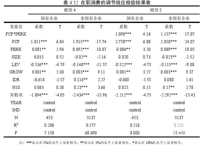 (2)基于不同所有權(quán)性質(zhì)下自由現(xiàn)金流與在職消費(fèi)關(guān)系的研究表明:在非國有企業(yè)中,自由現(xiàn)金流與在職消費(fèi)顯著正相關(guān),這一結(jié)果與學(xué)者陳紅明(2005)等的觀點(diǎn)基本一致[67]  ,而在國有企業(yè)中,二者相關(guān)關(guān)系并不顯著。對(duì)于非國企業(yè)而言,內(nèi)部留存的自由現(xiàn)金流越多,可能會(huì)一定程度影響管理層在職消費(fèi)的動(dòng)機(jī),特別是在自由現(xiàn)金流充足的企業(yè),其管理層可能出于激進(jìn)的心理,更容易產(chǎn)生在職消費(fèi)的欲望。而在國有企業(yè)中,由于實(shí)行的薪酬管制,內(nèi)部管理層在進(jìn)行在職消費(fèi)時(shí)并不會(huì)過多的考慮企業(yè)內(nèi)部是否有充足的自由現(xiàn)金流,故國有企業(yè)的自由現(xiàn)金流并不會(huì)對(duì)管理層的在職消費(fèi)產(chǎn)生作用。