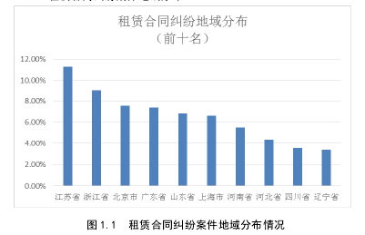 筆者主要通過“中國裁判文書網”進行案例檢索,對全國租賃合同糾紛案件進行檢索、篩選與統(tǒng)計。筆者在“中國裁判文書網”中以“租賃合同”作為檢索關鍵詞,便于囊括所有與租賃合同相關的案件;將裁判文書選擇為僅包括“判決書”,排除了裁定書、決定書,有助于更準確的定位租賃合同案件中的實體問題,篩除與實體問題無關的程序性問題;考慮到“中國裁判文書網”的開通時間2,同時也是為保證檢索結果的時效性,筆者將時間范圍限定為 2013 年1 月 1 日至 2015 年 12 月 31 日;在案由方面,筆者將案由限定為民事案由中的租賃合同糾紛,排除了僅在判決書全文中涉及租賃合同但并非屬于租賃合同糾紛的案件。此外,為保證筆者的檢索能夠全面客觀反映我國租賃合同糾紛案件的整體情況,筆者沒有對法院層級進行限定,法院層級中包括了最高人民法院、各高級人民法院、各中級人民法院以及各基層人民法院。通過以上檢索筆者共檢索到案件 113190 個。筆者共選取了三個角度對檢索結果進行分析:案件地域分布、案件案由分布、原告身份比例,從不同的側面總結租賃合同糾紛案件的基本情況。從租賃合同糾紛案件地域分布來看,我國租賃合同糾紛案件顯現出分布不均衡的現象,65.31%的租賃合同糾紛案件集中分布在十個區(qū)域:江蘇省、浙江省、北京市、廣東省、山東省、上海市、河南省、河北省、四川省以及遼寧省,其中江蘇省和浙江省更是典型的租賃合同糾紛頻發(fā)地區(qū),分別占據了租賃合同糾紛案件的 11.3%和 9%。不難看出,這些地區(qū)均為經濟較為發(fā)達的地區(qū),越是經濟發(fā)達的地區(qū)越涉及到租賃關系的建立,而大量的租賃關系的建立必然引發(fā)大量租賃法律關系的產生,從而導致租賃合同糾紛案件數量的攀升。經濟較為落后的中部或偏遠地區(qū)如黑龍江省、山西省、青海省以及海南省,租賃合同糾紛案件數量較少,分別僅占總案件數量的 0.7%、0.65%、0.37%和 0.36%。