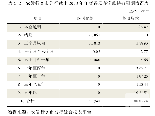 X 市位于我國中部,地屬黃土高原,屬欠發(fā)達(dá)地區(qū),轄內(nèi)共有縣、市區(qū) 10 余個(gè),總面積 2.5 萬平方公里,地形以丘陵、山地為主,其中耕地面積為 974 萬畝。全市總?cè)丝跒?310 萬,其中農(nóng)村人口 215 萬。該市市區(qū)及周邊兩縣地屬盆地,是該省糧食主產(chǎn)區(qū)之一,其中玉米產(chǎn)量占全市糧食總產(chǎn)量的四分之三,其余縣則均為山地、丘陵,多以小雜糧種植為主。同時(shí)該市西部四縣羊養(yǎng)殖在附近區(qū)域內(nèi)較為出名,羊年出欄近150 余萬只,除滿足轄內(nèi)羊肉需求外,多銷往外地。雖然 X 市近年來經(jīng)濟(jì)發(fā)展增速較快,高于其所在省平均水平,但由于基礎(chǔ)弱,基數(shù)小,因此整體經(jīng)濟(jì)發(fā)展水平在全省排名墊后。2013 年,X 市地區(qū)生產(chǎn)總值完成 654.7億元,同比增長 9%,總量僅占到全省的 5%;財(cái)政總收入完成 144.1 億元,同比下降0.1%,其中公共財(cái)政預(yù)算收入完成 73.7 億元,同比增長 13.1%;財(cái)政收入總量在全省位列倒數(shù)第三,其中公共財(cái)政預(yù)算收入僅占到全省總量的 4%;城鎮(zhèn)居民人均可支配收入 20324 元,同比增長 9.9%,農(nóng)民人均純收入 5423 元,同比增長 13.6%,總量處在全省末位。X 市也是全國較為貧困的地區(qū)之一,其所轄縣、市中有 11 個(gè)屬國家扶貧開發(fā)重點(diǎn)縣。農(nóng)發(fā)行 X 市分行于 1996 年 12 月從該市農(nóng)行劃分出來,成為了該市唯一一家農(nóng)業(yè)政策性銀行,成立之初全行職工人數(shù)為 212 人,目前正式職工 204 人。中共黨員 139名,占比為 68.1%;男女職工比例基本持平;從學(xué)歷構(gòu)成上看,具有大專及以上學(xué)歷的為 162 人,占比 76%,具有碩士學(xué)歷的僅為 5 人,占比為 2.4%;全轄員工平均年齡42.7 歲,其中 50 歲以上 56 人,占 27.5%;30 歲以下 61 人,占 29.9%,其中近 4 年招錄本科及以上學(xué)歷人員共計(jì) 26 人,極大的改善了該行的年齡結(jié)構(gòu)和學(xué)歷機(jī)構(gòu)。