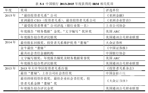 隨著我國資本市場的發(fā)展,IRM 日益受到上市公司管理層的重視,甚至將 IRM作為公司內(nèi)部治理的重要部分。就目前情況而言,我國上市商業(yè)銀行在 IRM 實踐方面仍存在很多不足,整體水平參差不齊,但也不乏成功的案例。其中,中國銀行的 IRM工作在國內(nèi)銀行業(yè),甚至是整個資本市場中較為先進(jìn),并多次獲獎,其成功經(jīng)驗對于上市商業(yè)銀行完善 IRM 工作具有很大的借鑒意義。