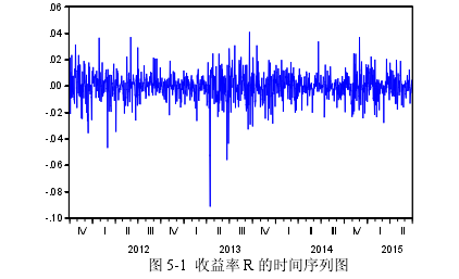 本文采用的數(shù)據(jù)是倫敦黃金現(xiàn)貨每日收盤價(jià)格。數(shù)據(jù)區(qū)間為紫金礦業(yè)收購左岸金礦項(xiàng)目后的時期至今,即紫金礦業(yè)持有該項(xiàng)目的時間 2011/09/29 日到 2016/05/02 日,扣除非營業(yè)日,共有 1165 個數(shù)據(jù)。其中選取 2011/09/29-2015/06/30 日共 977 個數(shù)據(jù),用于構(gòu)建 GARCH-Va R 模型和確定模型的估計(jì)參數(shù),剩余 2015/06/30-2016/05/02 日的共 219 個數(shù)據(jù),用于檢驗(yàn)構(gòu)建的 GARCH-Va R 模型的有效性。數(shù)據(jù)來源是大智慧軟件。采用 Eviews8.0 軟件對數(shù)據(jù)進(jìn)行處理。采用 Eviews 軟件計(jì)算得出黃金現(xiàn)貨收益率序列如下圖。從圖中可以看出 LME 黃金現(xiàn)貨收益率序列 R 的波動總體較為平穩(wěn),但是也可以經(jīng)常觀測到異常值的出現(xiàn)且次數(shù)較為頻繁,可以認(rèn)為該序列存在集聚性和爆發(fā)性,屬于隨機(jī)序列。對黃金現(xiàn)貨收益率序列進(jìn)行進(jìn)一步處理,對數(shù)據(jù)的統(tǒng)計(jì)特征進(jìn)行進(jìn)一步觀察。得到收益率的柱形統(tǒng)計(jì)圖。從圖中可以看出黃金現(xiàn)貨的對數(shù)收益率序列的均值(mean)是-0.000327,標(biāo)準(zhǔn)差(Std.Dev.)是 0.010671。同時從收益率序列的偏度(Skewness)-0.904481,看出收益率序列有長的左拖尾。而峰度(Kurtosis)10.48776,大于 3,表明分布突起程度大于正態(tài)分布,說明該收益率序列的分布具有 “尖峰后尾”特征。J-B 統(tǒng)計(jì)檢驗(yàn)得出該收益率序列拒絕服從正態(tài)分布的假設(shè)。