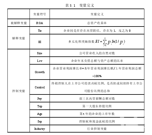 本文在研究企業(yè)間高管聯(lián)結(jié)、多元化投資與企業(yè)價(jià)值的關(guān)系時(shí),首先對(duì)相關(guān)變量進(jìn)行了界定和說明。在對(duì)企業(yè)價(jià)值進(jìn)行衡量時(shí),通常包括四類指標(biāo):現(xiàn)金流指標(biāo)、財(cái)務(wù)績(jī)效指標(biāo)(ROA)、市場(chǎng)績(jī)效指標(biāo)(Tobin’s Q)、經(jīng)濟(jì)增加值(EVA)。在對(duì)指標(biāo)進(jìn)行選擇的過程中,既要從自變量的角度進(jìn)行考慮,又要從指標(biāo)獲取的難易程度進(jìn)行考量。現(xiàn)金流指標(biāo)只是對(duì)企業(yè)單獨(dú)的受益程度進(jìn)行的衡量,缺乏全面性。市場(chǎng)績(jī)效指標(biāo)和經(jīng)濟(jì)增加值指標(biāo)具有較強(qiáng)的綜合性,但計(jì)算較為復(fù)雜,不以獲取。企業(yè)的財(cái)務(wù)指標(biāo)由于較易獲得并且綜合能力強(qiáng),一直是評(píng)價(jià)企業(yè)績(jī)效的核心指標(biāo),因此本文采用 ROA 作為衡量企業(yè)價(jià)值的變量。Pay 表示薪酬最高的前三名高管薪酬總額的對(duì)數(shù)。高管薪酬在一定程度上反映出了企業(yè)對(duì)高管人員的激勵(lì)機(jī)制以及高管在企業(yè)中所擁有的地位和作用。Top 表示第一大股東持股比例。股東持股比例的變化反映出高管人員持有公司股份比例的變化,第一大股東持股比例能夠?qū)ζ髽I(yè)多元化投資決策產(chǎn)生一定影響,最終影響到企業(yè)價(jià)值。