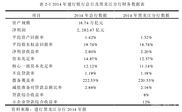 建設(shè)銀行黑龍江省分行是中國(guó)建設(shè)銀行所屬的一級(jí)分行。近年來,黑龍江分行發(fā)展迅速,截至到 2014 年底,共有市地分行 12 家,城區(qū)支行 96 家、縣級(jí)支行 56 家,分理處 224 家、儲(chǔ)蓄所 54 家。主要業(yè)務(wù)有存款、貸款、代收代付等,近幾年,增加了中小企業(yè)貸款項(xiàng)目,總體上看,黑龍江分行發(fā)展良好,2014 年建設(shè)銀行黑龍江省分行貸款綜合收益率達(dá)到 8%,居全國(guó)首位,其中中小企業(yè)貸款綜合收益率達(dá)到 12%,具體數(shù)據(jù)見表 2-1。建行在機(jī)構(gòu)上設(shè)置了三級(jí)管理機(jī)制,即總行、分行、支行??傂?、省級(jí)分行、市級(jí)(自治區(qū))分行設(shè)立管理部門,為管轄行;其余為經(jīng)辦行,主要進(jìn)行銀行業(yè)務(wù)處理。建行黑龍江分行在機(jī)構(gòu)設(shè)置上按照建行總行的規(guī)定進(jìn)行設(shè)置,分行設(shè)置管理部門、市地級(jí)分行、縣級(jí)分行、營(yíng)業(yè)部。目前黑龍江分行的機(jī)構(gòu)數(shù)量如表 2-2 所示。 黑龍江分行的存款主要包括財(cái)政性存款(待結(jié)算財(cái)政款項(xiàng)、財(cái)政性活期存款、地方財(cái)政庫(kù)款、財(cái)政預(yù)算專項(xiàng)存款和財(cái)政預(yù)算外存款)、全口徑存款(企業(yè)存款與個(gè)人存款、同業(yè)存款)。