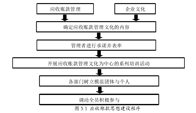 應收賬款的管理是一個系統(tǒng)工程,一個有效的應收賬款管理系統(tǒng)的實施必須要的到管理層的支持,管理層決定了應收賬款的管理高度,與管理的目標、政策、方針息息相關,應收賬款管理工作需要銷售部門、信用部門相互協(xié)作,全員參與。青島 SX 輪胎公司管理層對銷售部門的要求主要銷售額的提升,因銷售產(chǎn)生的應收賬款的風險管理意識薄弱,為了更好地實施青島 SX 輪胎公司的應收賬款管理改進方案,應在公司內(nèi)部推行應收賬款管理文化,從上到下、由略到詳?shù)闹鸩酵菩校嵘龖召~款風險防范理念。青島 SX 輪胎公司應收賬款管理的文化建設步驟見圖5.1。應收賬款管理文化的推進首先要引起管理層重視,將應收賬款管理的重要性與必要性以文字方式融入到公司的管理方針中去,由信用管理部門的信用管理專業(yè)人員向銷售部門。財務部門以及信用管理部門開辦專題講座,并傳達相關的政策,提高應收賬款管理專業(yè)知識的同時,調(diào)動員工自覺參與、監(jiān)督應收賬款風險管理意識。