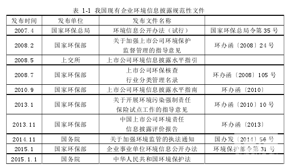 自從 1978 年實現(xiàn)改革開放到現(xiàn)在,我國已經(jīng)邁入“十三五”計劃的開局之年。在國際大環(huán)境經(jīng)濟頹靡的情況下,我國的經(jīng)濟發(fā)展速度依然遠高于國際平均發(fā)展速度。但我們的經(jīng)濟發(fā)展一定程度上是以犧牲環(huán)境為代價的。時有發(fā)生的環(huán)境污染事故已經(jīng)嚴重影響到每個人的日常生活,這使得社會公眾越來越重視身邊的環(huán)境污染問題。2015 年末,隴南市西和縣的隴星銻業(yè)尾礦庫不慎發(fā)生泄漏,導(dǎo)致含銻尾礦及尾礦水經(jīng)排水涵洞進入太石河,約 2.5 萬立方米的含銻尾礦及尾礦水泄漏,對沿線部分群眾生產(chǎn)生活用水造成了嚴重影響。2015 年,柴靜制作的霧霾調(diào)查紀錄片《穹頂之下》引爆了國人對霧霾與肺癌的狂熱討論,人們陷入了“PM2.5焦慮癥”。數(shù)據(jù)顯示,2015 年我國受霧霾天氣影響的面積約占國土面積 1/4,受影響人數(shù)約 6 億人,造成的經(jīng)濟損失難以估計。頻頻發(fā)生的環(huán)境污染事故已經(jīng)嚴重影響到每個人的日常生活,環(huán)境污染已經(jīng)演變成一種威脅人類生存與發(fā)展的全球性危機,這迫使社會公眾越來越重視身邊的環(huán)境污染問題。 除了來自社會公眾的壓力,作為利益相關(guān)者的政府機構(gòu)也將目光更多地投在企業(yè)保護環(huán)境方面的行為,同時要求企業(yè)將保護環(huán)境視為社會責(zé)任中不容忽視的一項重要任務(wù)。為了促使企業(yè)能夠更加積極主動地進行環(huán)境信息披露,我國先后頒布了一系列關(guān)于加強企業(yè)環(huán)境保護和做好環(huán)境信息披露的法律法規(guī)及規(guī)范性文件,這都為企業(yè)規(guī)范自身的環(huán)境信息披露行為提供了法律保障。表 1-1 列示了我國自 2007 年以來頒布的企業(yè)環(huán)境信息披露規(guī)范性文件。 2007 年我國環(huán)保部頒布《環(huán)境信息公開辦法(試行)》,辦法要求企業(yè)及其他經(jīng)濟組織部門要按時進行環(huán)境信息披露,環(huán)境信息披露須符合一定要求。2008 年,上交所出臺的《上市公司環(huán)境信息披露指引》,該指引對上市公司的環(huán)境信息披露提出完整、準(zhǔn)確、及時的要求。2010 年,環(huán)保部出臺《上市公司環(huán)境信息披露指南》,明確指出重污染行業(yè)要定期公開披露環(huán)境信息,對于其他非重污染行業(yè)則以鼓勵為主。2015 年初,中國出臺并且實施了《中華人民共和國環(huán)境保護法》。