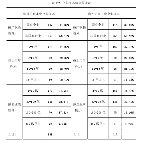 為了研究海外投資戰(zhàn)略對企業(yè)國際化程度的影響,第三章在梳理并分析海外直接投資理論、企業(yè)國際化理論、投資效率行為理論的基礎(chǔ)上,提出了本文研究假設(shè)。本章將用實(shí)證方法進(jìn)一步驗(yàn)證海外擴(kuò)張速度和海外擴(kuò)張廣度對主板上市公司國際化程度的影響。本章需要完成的實(shí)證工作包括:一是建立衡量海外擴(kuò)張速度和海外擴(kuò)張廣度與國際化程度之間相關(guān)關(guān)系的度量模型;二是通過投資效率度量模型將樣本區(qū)分為效率投資與非效率投資后,再次進(jìn)行回歸檢驗(yàn),以檢驗(yàn)投資效率是否對海外投資戰(zhàn)略與企業(yè)國際化程度之間關(guān)系存在調(diào)節(jié)作用;三是為保證前述實(shí)證結(jié)論的穩(wěn)健性,對上述結(jié)果進(jìn)行穩(wěn)健性檢驗(yàn)。