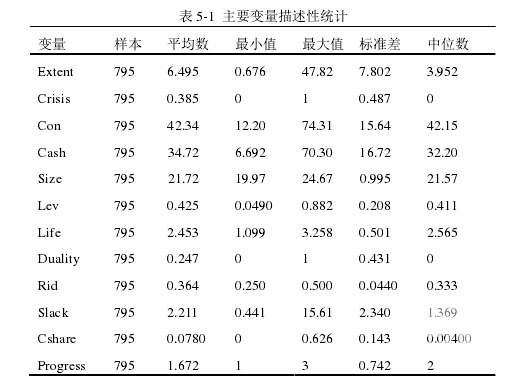本文研究了 2002—2015 年我國(guó) A 股上市家族企業(yè)的數(shù)據(jù),經(jīng)過(guò)多輪的收集篩選共取得 134 家企業(yè),795 個(gè)觀測(cè)樣本。在這部分樣本中,本文根據(jù)家族企業(yè)接班二代在企業(yè)高管團(tuán)隊(duì)中的職位變動(dòng)情況,對(duì)每個(gè)家族企業(yè)所處代際傳承階段進(jìn)行了詳細(xì)的劃分。根據(jù)統(tǒng)計(jì),截止 2015 年,在本文所選取的 134 家之中,有 66家上市家族企業(yè)處于代際傳承第一階段(參與管理階段),一代仍然把握著企業(yè)經(jīng)營(yíng)發(fā)展的主體方向,占總樣本的 49.25%;有 44 家家族企業(yè)已經(jīng)進(jìn)入共同管理階段,接班二代已經(jīng)擔(dān)任公司的總經(jīng)理,在公司經(jīng)營(yíng)中起著關(guān)鍵作用,這一部分樣本占了 32.84%;而樣本中僅有 24 家上市家族企業(yè)完成了代際傳承,處于接收管理階段,接班二代擔(dān)任公司的董事長(zhǎng),完全負(fù)責(zé)企業(yè)的經(jīng)營(yíng)管理,這一部分企業(yè)占了總樣本的 17.91%。從上述樣本初步可以看出,我國(guó)上市家族企業(yè)完全完成代際傳承的企業(yè)數(shù)量還是不多,大部分在代際傳承進(jìn)程中的上市家族企業(yè)都還處于參與管理階段。所以,如果更好的避免傳承危機(jī)的發(fā)生,完成代際傳承的任務(wù),對(duì)每個(gè)家族企業(yè)都顯得十分重要。 本文所涉及的主要變量描述性統(tǒng)計(jì)如表 5-1 所示,主要包括了回歸模型中的主要變量的樣本數(shù)、平均值、最大值、最小值、標(biāo)準(zhǔn)差和中位數(shù)。本文主要研究的被解釋變量傳承危機(jī)(Crisis)為虛擬變量,取值為 0 或 1,平均值為 0.385,說(shuō)明在整體樣本中發(fā)生傳承危機(jī)的樣本數(shù)量要少于沒(méi)有發(fā)生傳承危機(jī)的樣本。傳承危機(jī)程度(Extent)的最大值和最小值分別為 47.82 和 0.676,說(shuō)明代際傳承中的不同家族企業(yè)財(cái)務(wù)健康程度相差較大。而主要解釋變量控制家族終極控制權(quán)(Con)和控制家族現(xiàn)金流權(quán)(Cash)最大值與最小值之間同樣相差較大,標(biāo)準(zhǔn)差分別為 15.64 和 16.72,反映了不同上市家族企業(yè)控股家族對(duì)企業(yè)的控制程度有著較為顯著的差距。有些企業(yè)選擇高度控制家族企業(yè),而有些企業(yè)則選擇相對(duì)開(kāi)放的股權(quán)結(jié)構(gòu),吸引更多的投資者投資到家族企業(yè)中。在控制變量上,不同家族企業(yè)的規(guī)模、財(cái)務(wù)杠桿、成立年限以及公司治理情況都有明顯的不同。公司資產(chǎn)負(fù)債率(Lev)最大值和最小值分別為 0.882 和 0.049,說(shuō)明不同上市家族企業(yè)的舉債程度差異較大,有些公司會(huì)有高額的負(fù)債,而有些公司則會(huì)采用較少舉債的策略?;旧希饕兞康拿枋鲂越y(tǒng)計(jì)還是與現(xiàn)實(shí)狀況相符,沒(méi)有出現(xiàn)特別異常的數(shù)據(jù)。