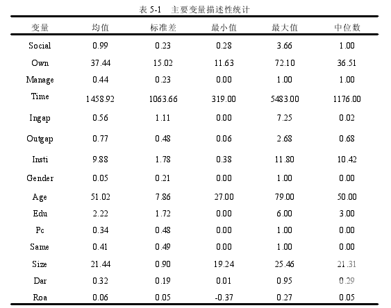 表 5-1 是對 3095 個上市家族企業(yè)樣本觀察值的描述性統(tǒng)計結(jié)果,主要把握變量的分布狀態(tài)及主要特點(diǎn),包括均值、標(biāo)準(zhǔn)差、最值和中位數(shù)。通過表 5-2 可以看出,家族涉入的三個代理變量均與社會責(zé)任履行度呈顯著正相關(guān)關(guān)系。具體而言:家族所有權(quán)、家族控制時間在 1%的水平上對社會責(zé)任履行度有顯著的正向影響;家族控制權(quán)則在 5%的水平上對社會責(zé)任履行度有顯著的正向影響,本文假設(shè) 1 得到初步驗證,調(diào)節(jié)變量內(nèi)部期望績效壓力、資本市場績效壓力均在 1%的水平上對社會責(zé)任履行度有顯著負(fù)向影響。董事長個人特征層面:僅董事長年齡在 1%水平上對社會責(zé)任履行度有顯著負(fù)向影響;年齡、教育以及政治身份對社會責(zé)任履行度有正向影響,但相關(guān)性水平并不顯著;董事長兼任總經(jīng)理的情況則對社會責(zé)任履行度有不顯著的負(fù)向影響。企業(yè)層面:企業(yè)規(guī)模、資產(chǎn)負(fù)債類在 1%水平上對社會責(zé)任履行度有顯著的正向影響;而資產(chǎn)收益率也在 1%水平上對社會責(zé)任履行度有顯著的負(fù)向影響。