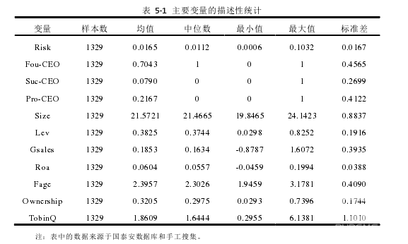 本文選取了 2010-2012 年滬深兩市 A 股 443 家上市家族企業(yè)的數(shù)據(jù),共獲得 1329 個觀測值。根據(jù) Excel 表格的匯總分析,截止到 2012 年底,1329 個觀測值中創(chuàng)始人擔(dān)任 CEO 的觀測值為 936 個(占比 70.43%),家族繼任者當(dāng)任 CEO 的觀測值為 105 個(占比 7.90%),職業(yè)經(jīng)理人擔(dān)任 CEO 的觀測值為 288 個(占比21.67%)。從中可以發(fā)現(xiàn),我國大部分家族企業(yè)仍由創(chuàng)始人掌權(quán),完成二代接班的企業(yè)只占 7.90%,這與《福布斯 2012 年中國家族企業(yè)調(diào)查報告》顯示的完成二代接班的家族企業(yè)占比 7%的結(jié)果較為接近。為了全面的了解樣本數(shù)據(jù)的特征,本文針對主要變量的樣本數(shù)、均值、中位數(shù)、最小值、最大值和標(biāo)準(zhǔn)差進(jìn)行了描述性統(tǒng)計,描述性統(tǒng)計的結(jié)果如表 5-1 所示。樣本企業(yè)風(fēng)險承擔(dān)水平的均值為 0.0165,中位數(shù) 0.0112,李文貴和余明桂(2012)研究我國滬深 A 股上市公司的風(fēng)險承擔(dān)水平的均值為 0.0611,中位數(shù)為 0.0335。兩者相比不難發(fā)現(xiàn),我國家族企業(yè)的風(fēng)險承擔(dān)水平明顯低于我國上市公司的風(fēng)險承擔(dān)水平,這也說明了我國家族企業(yè)確實存在著風(fēng)險規(guī)避的傾向。家族企業(yè)的 CEO 來源,家族創(chuàng)始人 CEO(Fou-CEO)、家族繼任者 CEO(Suc-CEO)以及職業(yè)經(jīng)理人 CEO(Pro-CEO)都是取值為 0 或 1的虛擬變量,其均值和 Excel 的統(tǒng)計結(jié)果一致,這里不再贅述。分析家族企業(yè)的企業(yè)規(guī)模均值為 21.5721,最小值和最大值分別為 19.8465 和 24.1423,標(biāo)準(zhǔn)差為0.8837,這表明在企業(yè)規(guī)模上各個家族企業(yè)存在著較大的差異。從資本結(jié)構(gòu)來看,家族企業(yè)資本結(jié)構(gòu)的均值為 0.3825,中位數(shù) 0.3744,低于我國上市公司負(fù)債率的一般水平,其原因可能是家族企業(yè)的融資相比國有企業(yè)更加困難,同時家族企業(yè)對資金的運用更為謹(jǐn)慎。家族企業(yè)的銷售增長、期初績效和上市年限三項指標(biāo)與李文貴和余明桂(2012)研究結(jié)果基本一致。從家族所有權(quán)結(jié)構(gòu)來看,家族所有權(quán)的均值為 0.3205,中位數(shù)為 0.2975,標(biāo)準(zhǔn)差為 0.1744,表明家族企業(yè)普遍重視對企業(yè)所有權(quán)的掌控。對于家族企業(yè)的發(fā)展情況可以通過托賓 Q 值看出,托賓 Q值的平均值為 1.8609,均值 1.6444,表明我國家族企業(yè)發(fā)展態(tài)勢良好,同時最小值和最大值分別為 0.2955 和 6.1381,標(biāo)準(zhǔn)差為 1.1010,也表明了家族企業(yè)的發(fā)展速度存在著明顯的差異。